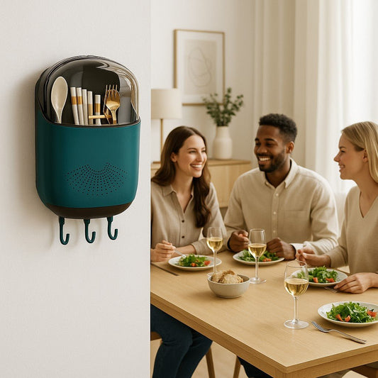 Pour les cuisines disposant de peu d'espace dans les tiroirs, le Rangement à couverts- mural offre une solution alternative pratique. Fixé au mur, il libère de l'espace dans vos tiroirs tout en gardant vos ustensiles à portée de main.
